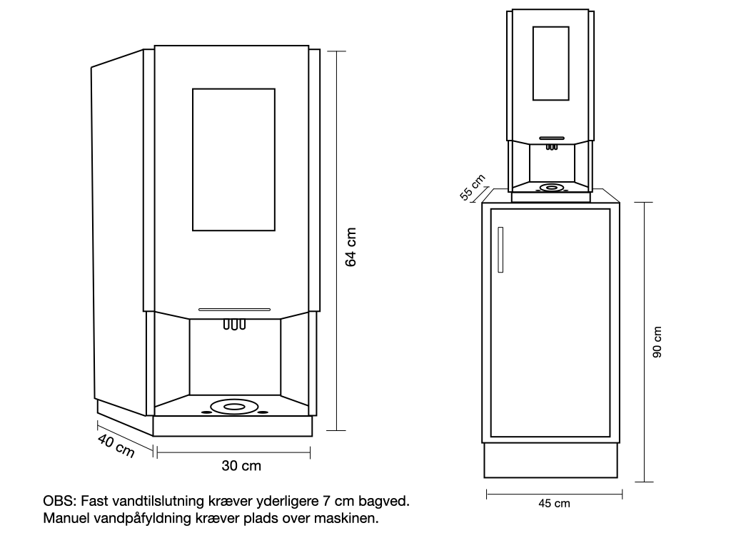 Cafeumat Instant Touch™ har integreret vandtank, så den ikke behøver fast vandtilslutning. Dermed kan den installeres steder, hvor der ikke er indlagt vand – altså alt fra skurvogne til kontormiljøer. Ønsker du at slippe for manuel påfyldning, kan vi tilslutte vand eller en pumpestation med højere kapacitet.