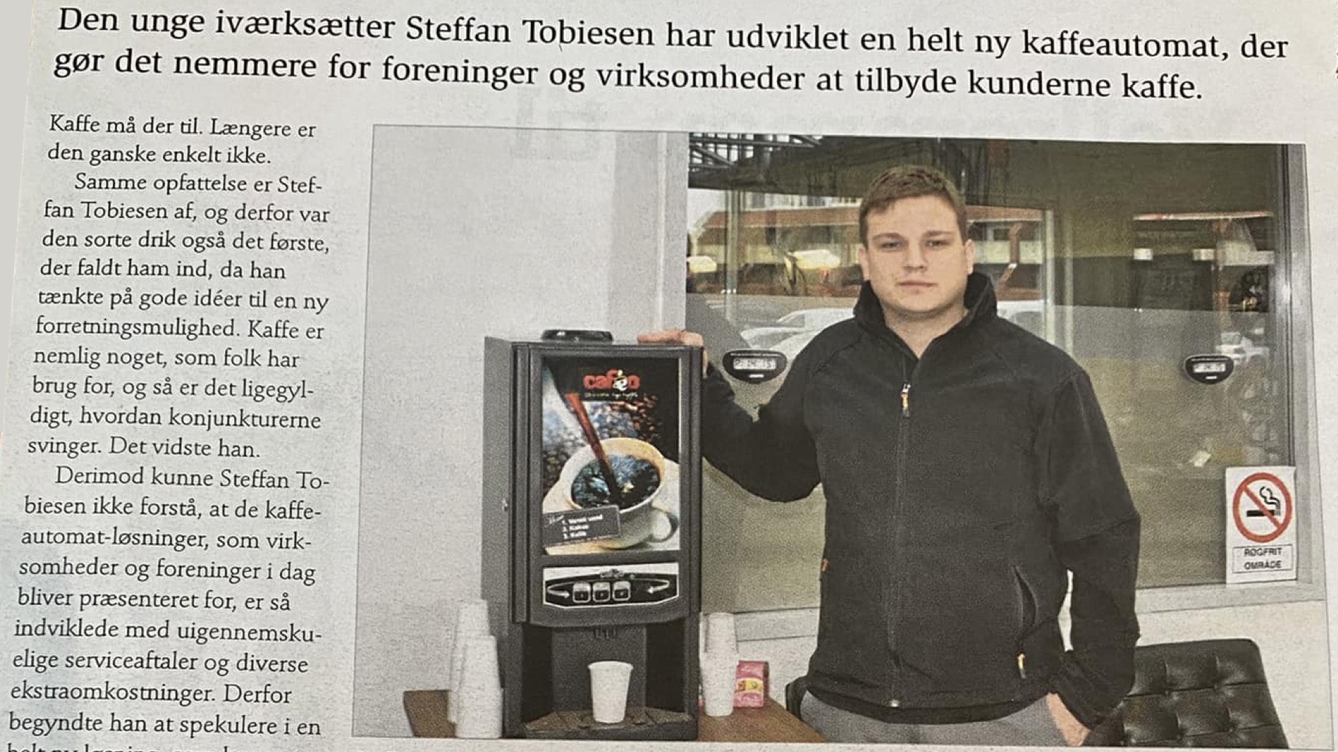 “Hvis ikke jeg kan få finansieret noget, kan andre små virksomheder heller ikke. Det må jeg kunne drage nytte af. Jeg vidste at kaffemaskiner var dyre at investere i. Så jeg købte 30 kaffeautomater, som jeg satte op, primært hos frisørsaloner her i Esbjerg. Små virksomheder som ikke selv havde råd til at købe eller finansiere professionelle automater. Så i stedet betalte de her små virksomheder hver gang de trykkede på automaten for at købe en kop kaffe.”